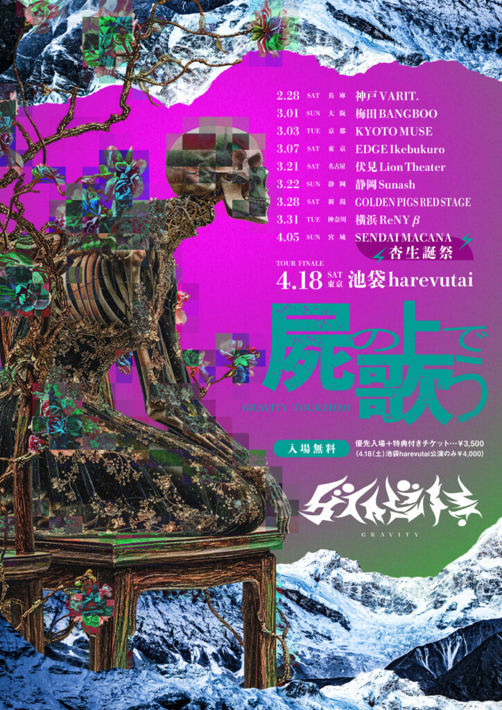 2026年03月07日(土) グラビティONEMAN LIVE 「屍の上で歌う」TOUR 〜東京〜 ■会場 池袋EDGE ■時間 OPEN 16:00 / START 16:30 ■チケット 前売:¥3,500 当日:¥0 ■出演 グラビティ ■チケット発売日 プレオーダー e+ 2026/01/17(土)...