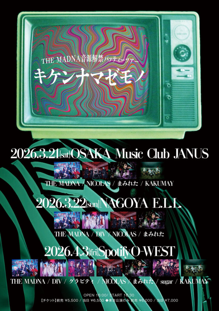 2026年04月03日(金) THE MADNA音源解禁パァティーツアー キケンナマゼモノ ■会場 Spotify O-WEST ■時間 OPEN 16:30 / START 17:00 ■チケット 前売:¥6,000 当日:¥7,000 ■出演 グラビティ THE MADNA / DIV / NICOLA...