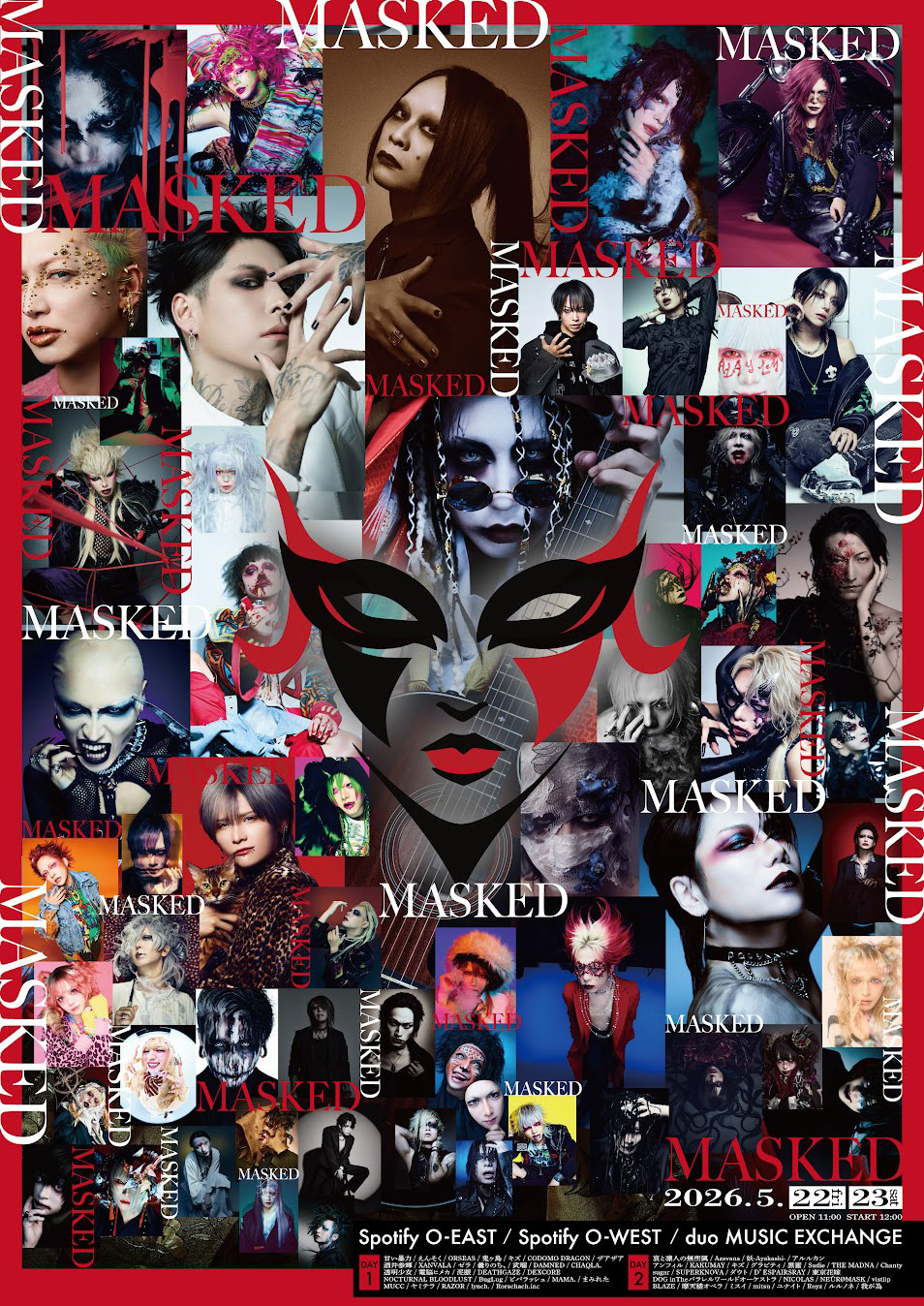 公演日:2026年5月23日(土) 会場:Spotify O-EAST , Spotify O-WEST , duo MUSIC EXCHANGE タイトル 「MASKED 2026」 出演者 【5月23日(土) DAY.2】 哀と凛人の無所属 / Azavana / 妖-Ayakashi- / アルルカン...