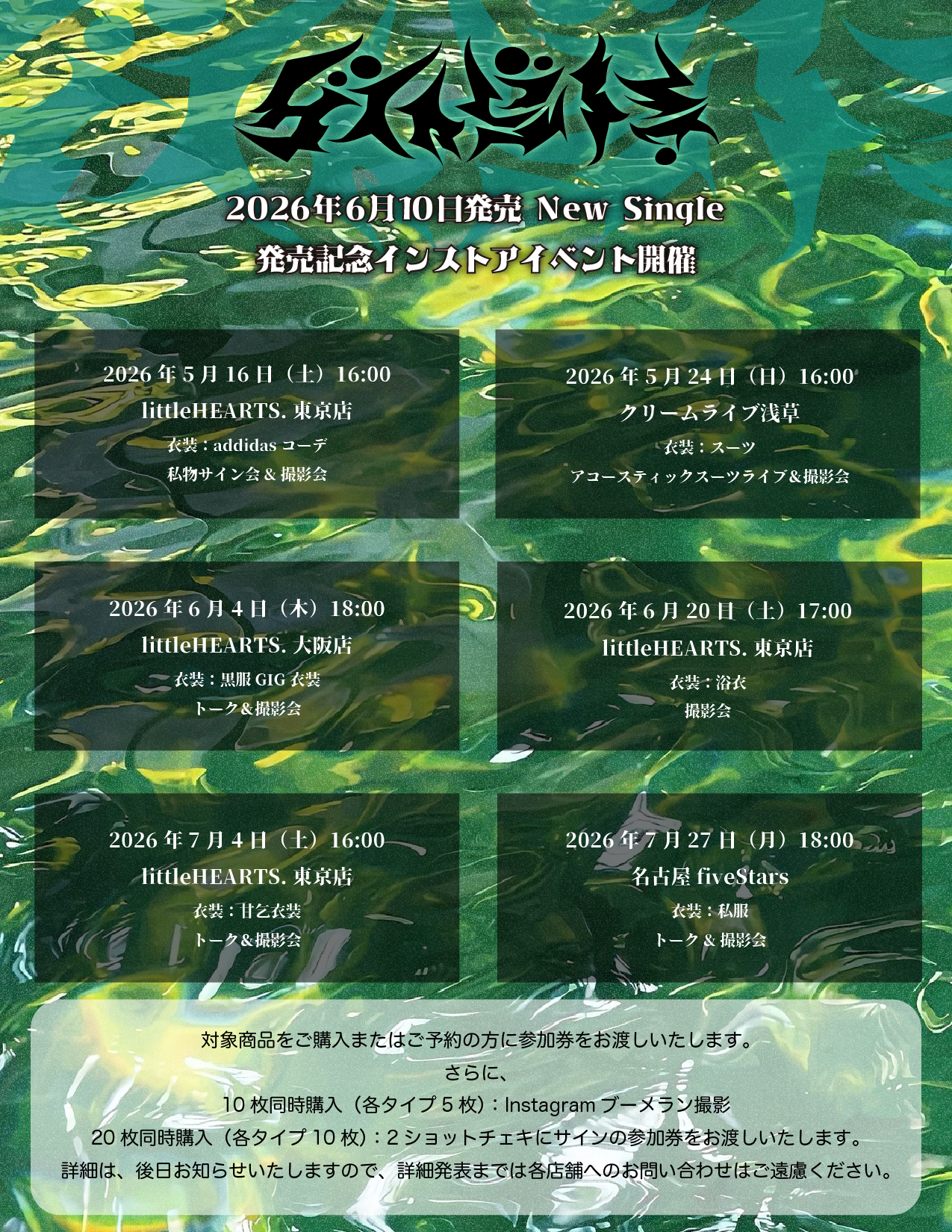 2026年7月27日(月) New Single 発売インストアイベント ■会場 名古屋fiveStars ■時間 18:00 ■内容 トーク&撮影会 ■衣装 私服 ※詳細後日解禁